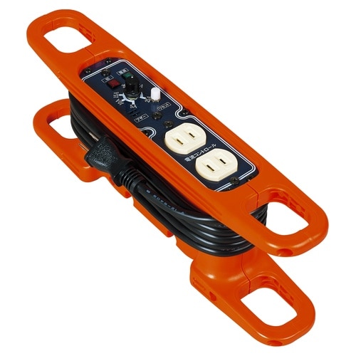 屋内型の100Vハンドリール3mです。使用電流をつまみで簡単に5A―25Aまで設定でき、使用電流が設定電流値を超えると電気をストップします。 |