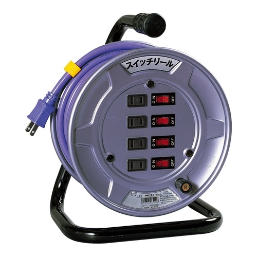 屋内型の100V電工ドラム10mです。個別にスイッチが付いており、プラグの抜き差しなしでON/OFFができます。入力プラグは2Pプラグです |