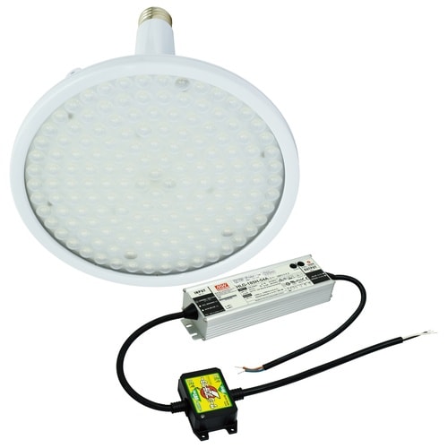 屋内型、AC100/200V兼用、常設用口金式LED照明です。メタハラ400Wクラスの明るさ(当社比)電源装置外付型、照射角度はスポット、カバーは明るさ重視のクリア(透明)です。 |