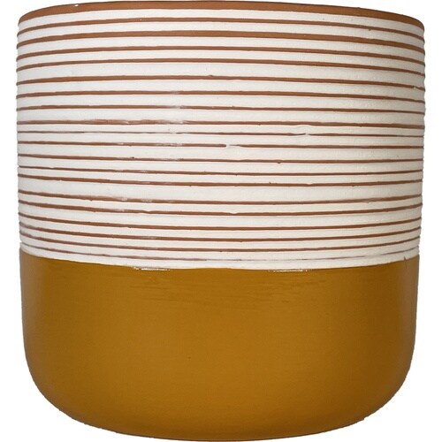 テラコッタとホワイトのボーダー、艶のあるはっきりとしたカラーのツー トンデザインの少し深めな陶器鉢です。 |