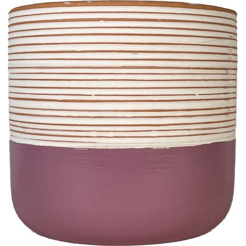 テラコッタとホワイトのボーダー、艶のあるはっきりとしたカラーのツー トンデザインの少し深めな陶器鉢です。