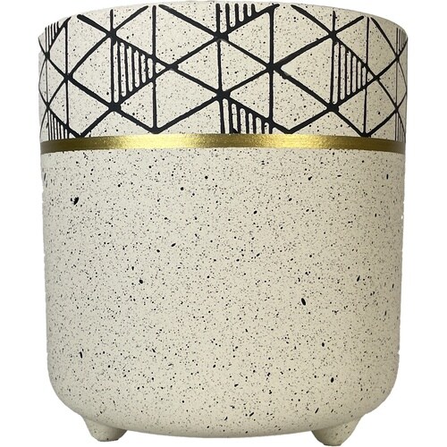 ゴールドのリングラインと幾何学模様が特徴のデザイン陶器鉢です。少し深めの構造で、足つき のため通気性など機能面もよいです。 |