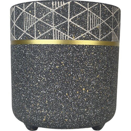 ゴールドのリングラインと幾何学模様が特徴のデザイン陶器鉢です。少し深めの構造で、足つき のため通気性など機能面もよいです。