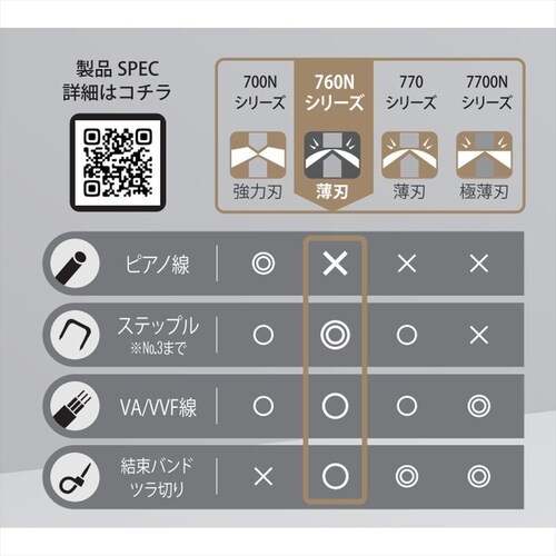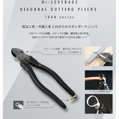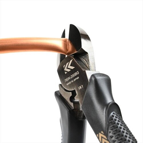 ・銅管潰し切り、ステップル(No.3)、VA/VVF線の切断から、結束バンドのツラ切まで可能な万能ニッパ。 |