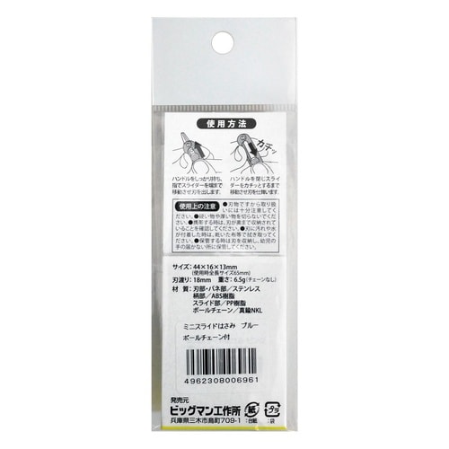 サイズ(mm):44×16×13(使用時全長サイズ65) | 質量(g):6.5(チェーンなし) | 刃渡り(mm):18 | 付属品:ボールチェーン…