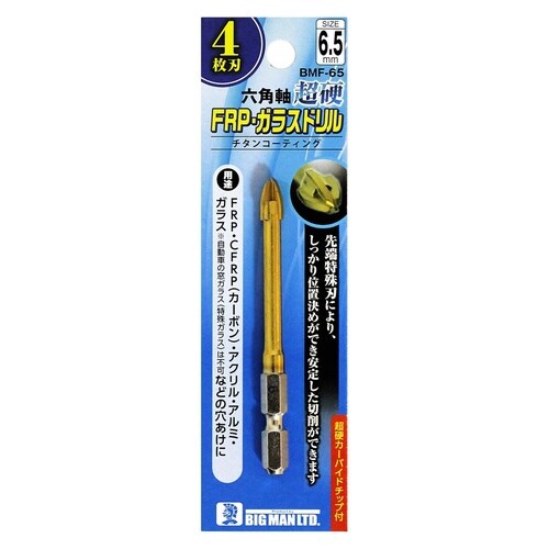 穴径(mm):6.5 | 軸径:6.35mm(六角軸) | 仕様:刃先(4枚刃)・超硬カーバイドチップ付 | タイプ:ガラスドリル | 最高回転数(m…