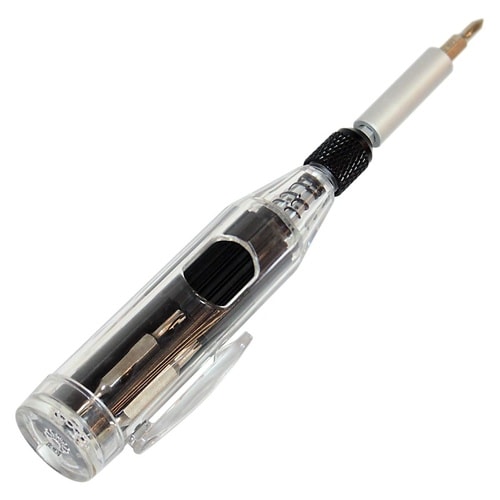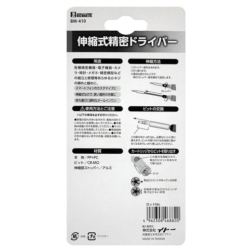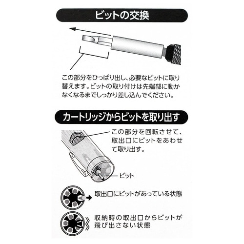 ・両頭ビット6本(12サイズ)がオールインワン!。・持ち運びに便利なオールインワン。・本体内蔵の回転個所を回せば簡単にビットが取り出せます。・伸縮式なので、狭い箇所の作業にも。 |
