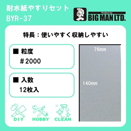 ・使いやすい!収納しやすい!。・76×140mmにカットしてあり、使いやすく収納しやすいサイズが重宝されます。・12枚入り。・粒度:#2000。・タイプ:耐水紙ヤスリ。・12枚入り。 |