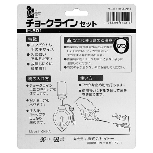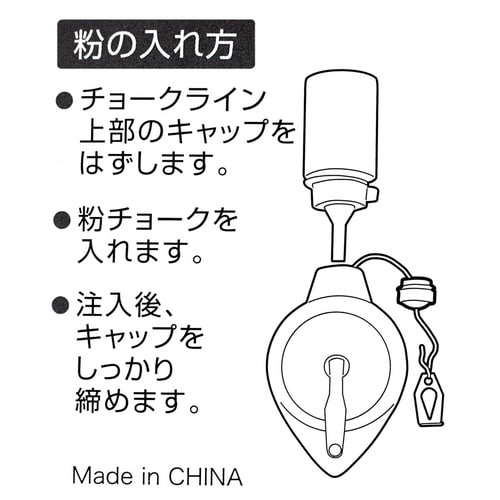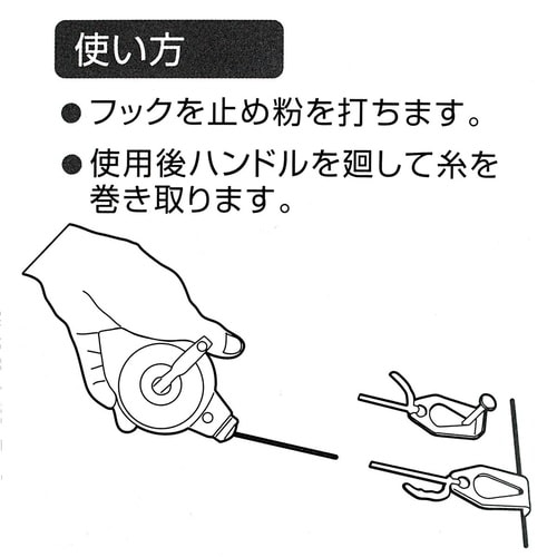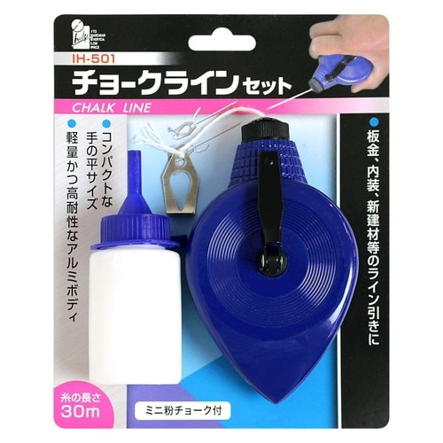 ・アルミボディで軽量かつ高耐性!。・コンパクトな手のひらサイズ。・軽量かつ高耐性なアルミボディ、火にも強い。・故障しにくい簡単設計。・ミニ粉チョーク付き。・糸の長さ:30m。 |