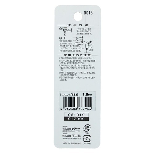 穴径(mm):1.8 | 軸径(mm):1.8丸軸 | タイプ:鉄工用 | 仕様:先端研磨シンニング刃 | 適応材:鉄・銅・アルミ・プラスチック・木材…