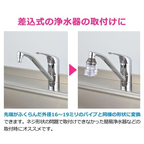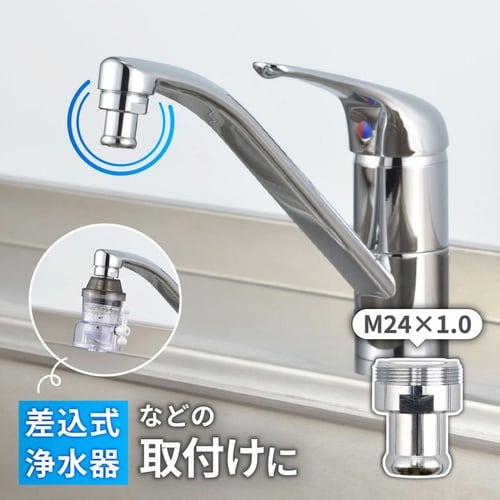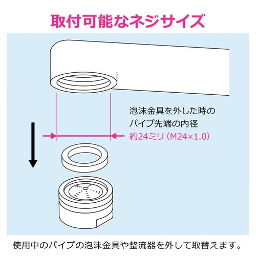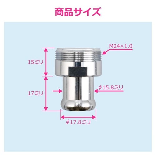・泡沫金具ネジのM24×1.0をホースや簡易浄水器を接続するためのふくらみのあるパイプ形状にするアダプターです。 |