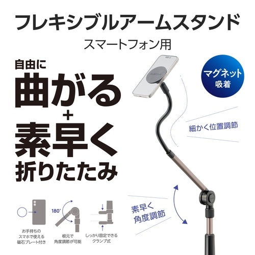 どんな姿勢のときも、ちょうどいい角度でスマートフォンをキープ。マグネットでスマートフォンを簡単に着脱できる、マグネットスタンドです。MagSafe非対応機種にも対応するメタルプレート付き。 |