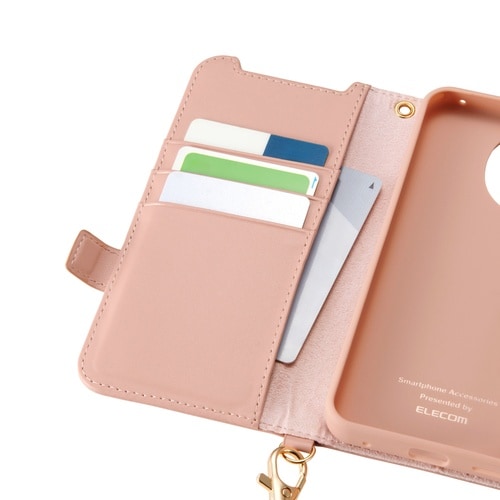 4つのカードポケットを備えた、ハンドストラップ付きの手帳型ケースです。