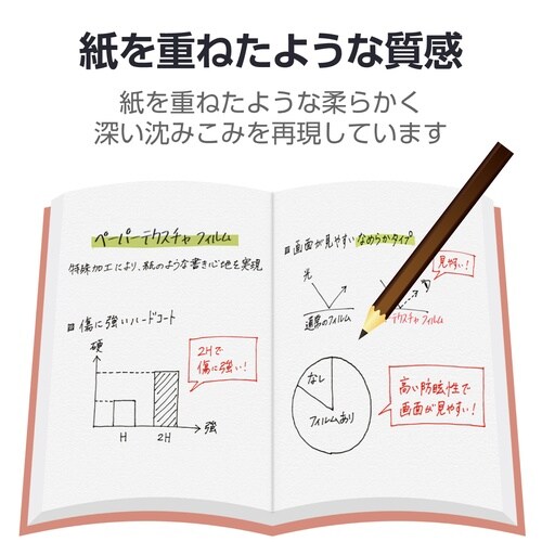画面を傷や汚れから守る、指紋防止、反射防止タイプの紙心地フィルムです。特殊構造により、適度なペンの沈み込みを実感できる「文字を書く」ことにこだわった画面保護フィルムです。 |