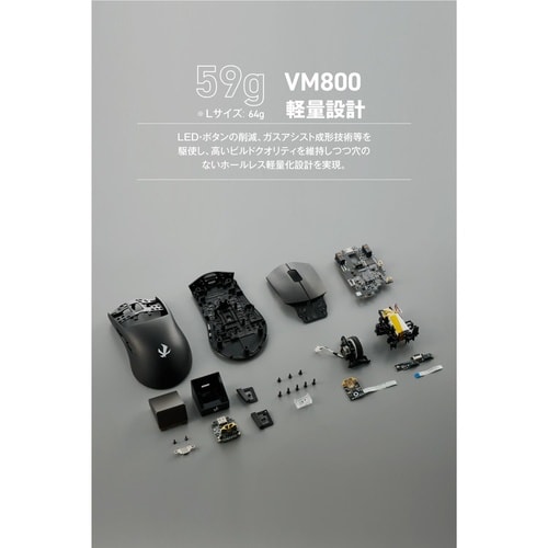 UWB(超広帯域)無線通信を採用した、エレコムのハイクラス・ゲーミングマウス“VM800”です。右利きに最適化された左右非対称形状のガンシューティング系ゲーム(FPS)向け軽量ゲーミングマウスです。 |