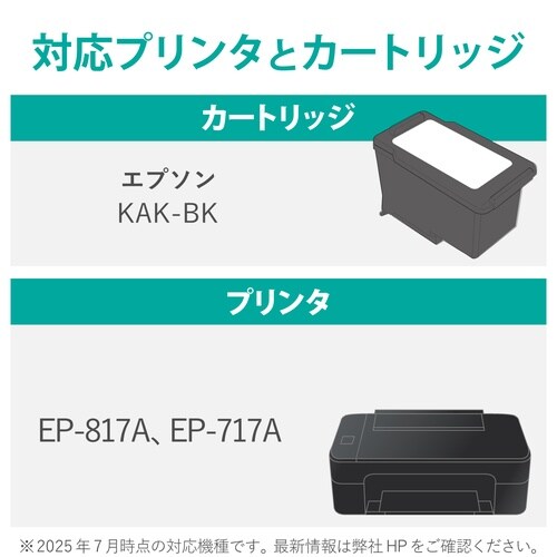 対応カートリッジ:エプソン KAK−BK 対応プリンター:EP−817A、EP−717A ※2025年7月時点の対応機種です。最新の対応情報は弊社ホームページにてご確認ください。 |
