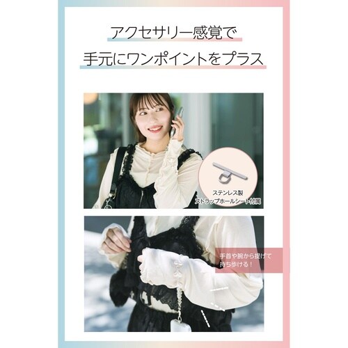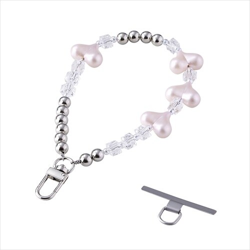 不規則に散りばめられたハートチャームが、ほどよい甘さと抜け感を演出するハンドストラップです。首や腕から提げて持ち歩けるので、両手がふさがらずいつでもサッとスマートフォンの操作ができます。 |