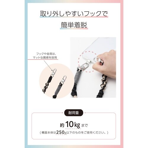 編み模様と配色にこだわったデザインで、手元にさりげない彩りを添えるハンドストラップです。手首や腕から提げて持ち歩けるので、両手がふさがらずいつでもサッとスマートフォンの操作ができます。 |