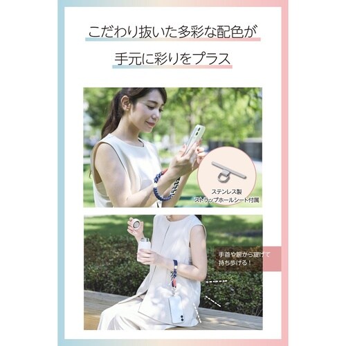 編み模様と配色にこだわったデザインで、手元にさりげない彩りを添えるハンドストラップです。手首や腕から提げて持ち歩けるので、両手がふさがらずいつでもサッとスマートフォンの操作ができます。