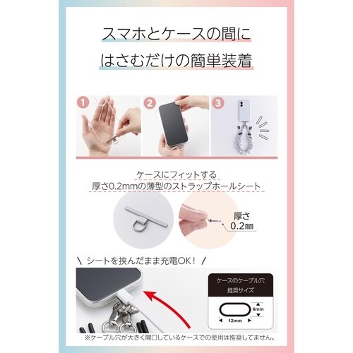 サイズ:ハンドストラップ:全長約200mm−約500mm、ストラップホールシート:W約45mm×D約0.2mm×H約23mm | 耐荷重:約10kgま…