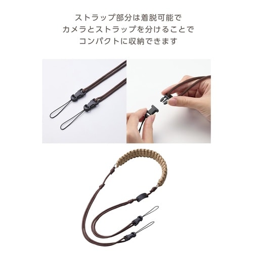 “instax”(チェキ)や“写ルンです”など、幅広いコンパクトタイプのカメラに使えるロープ編みデザインのネックストラップです。首掛け、肩掛け、たすき掛けの3WAYタイプ。