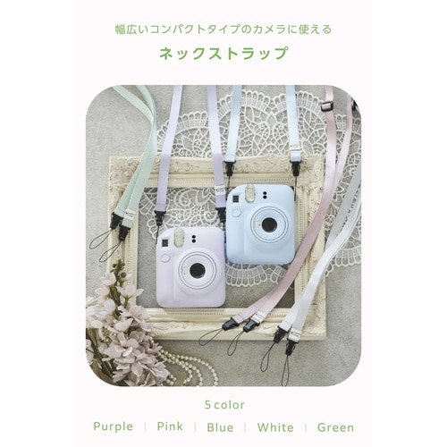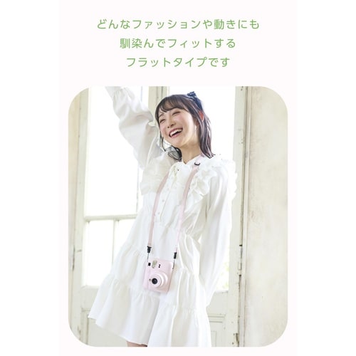 “instax”(チェキ)や“写ルンです”など、幅広いコンパクトタイプのカメラに使えるネックストラップです。首掛け、肩掛け、たすき掛けの3WAYタイプ。
