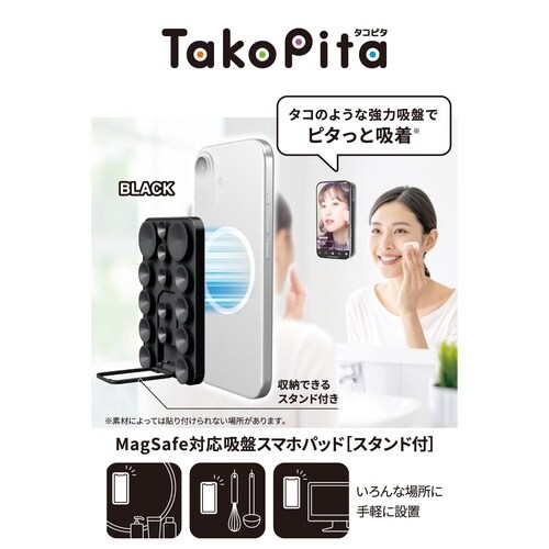 日常の“ながらスマホ”をより便利に!壁や鏡、窓ガラスなどの平らな面に、タコの吸盤のようにピタッと吸着する“TakoPita”スマホパッドです。