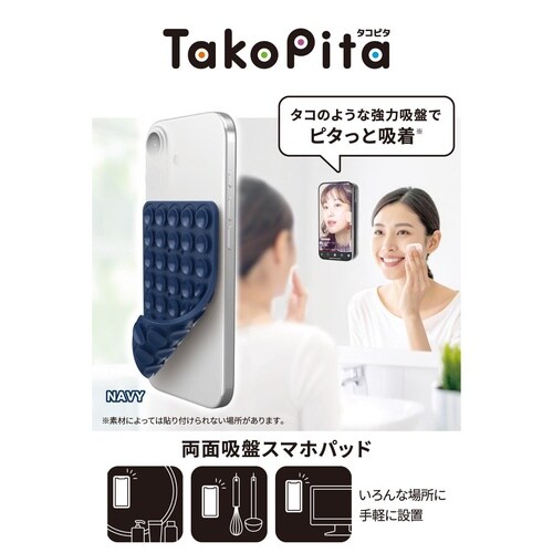 日常の“ながらスマホ”をより便利に!壁や鏡、窓ガラスなどの平らな面に、タコの吸盤のようにピタッと吸着する“TakoPita”スマホパッドです。