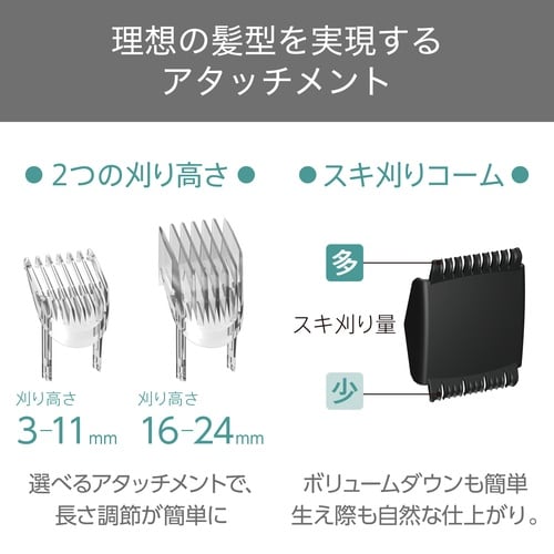 コードレスでどこでも快適カット。細かな調節が簡単にできる、使いやすいベーシックなヘアカッターです。防水設計で濡れ髪のカットも可能。USB Type−C充電式。 |
