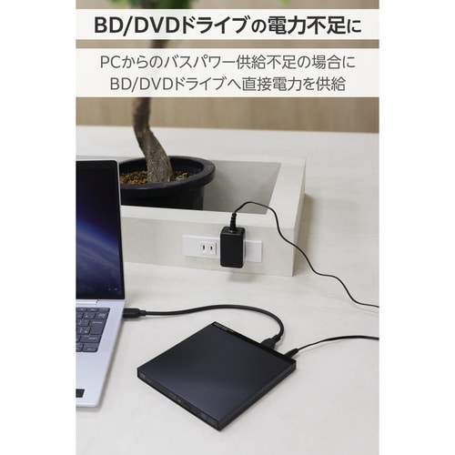 ポータブルDVD/BD製品の電力不足を補う別売オプション品 ― ACアダプター。バスパワー駆動では使用できないパソコンでもポータブルDVDやブルーレイドライブ製品を使用可能にするACアダプター。 |