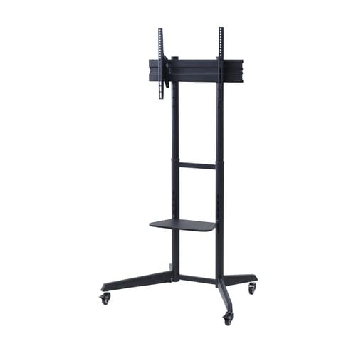37−70インチ対応、キャスター付きのディスプレイスタンド。耐荷重50kg。4段階に高さ調節ができる。上下角度調節も可能(チルト機能)。好みの高さに可動棚を設置できる。 |