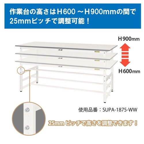 軽量作業台/耐荷重150kg 高さ調整式 半面棚付 低圧メラミン天板 ワークテーブル150 W900D750H600−900mm SUPA−975T−WW ホワイト 1台【メーカー直送】