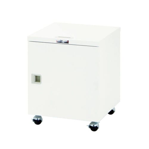 補助テーブルや脇机として使えるキャビネットワゴン。収納物の目隠しができる扉付きです。付属の自在棚は30mmピッチで高さ変更が可能で便利です。 |