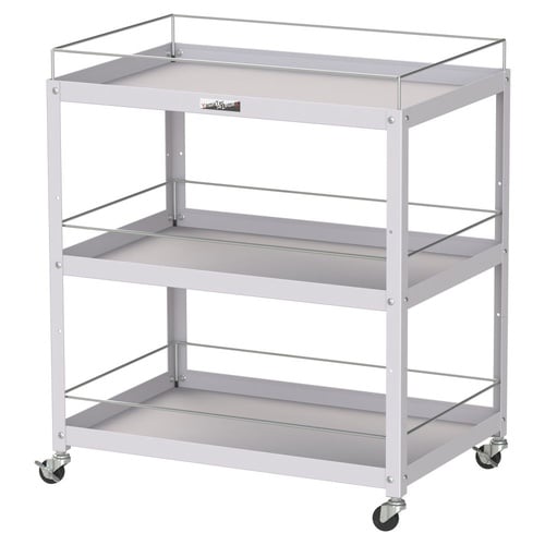 コンビニエンス(便利)なスチール製ツールワゴン。各段に棚板高さ+60mmのこぼれ止め付き!スプレー缶等の収納にも便利です。ゴムキャスターは弾性があり、凹凸のある地面でも走行しやすいです。 |
