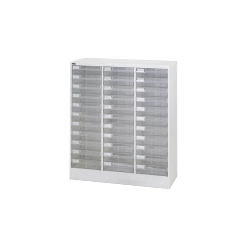 B4サイズ引出しの書類整理棚。文房具など小物収納用のフロアケースとしても役立ちます。引出しは透明のため収納物が見やすい。フラットファイルがそのまま入る大きめサイズの引出しで便利です。 |