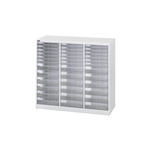 B4サイズ引出しの書類整理棚。文房具など小物収納用のフロアケースとしても役立ちます。引出しは透明のため収納物が見やすい。フラットファイルがそのまま入る大きめサイズの引出しで便利です。 |