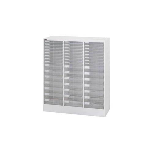 B4サイズ引出しの書類整理棚。文房具など小物収納用のフロアケースとしても役立ちます。引出しは透明のため収納物が見やすい。フラットファイルがそのまま入る大きめサイズの引出しで便利です。 |