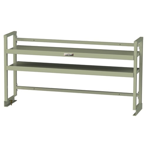 2段棚付きの作業台用上棚。作業に使う工具やパーツを手の届く位置に収納して作業効率アップ!傾斜可能の棚板で収納物が見えやすく取り出しやすい。棚板の取付位置は50mmピッチで可変。オールスチール製で頑丈! |