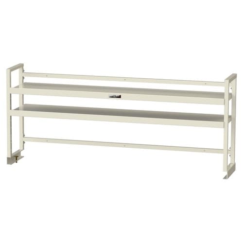 2段棚付きの作業台用上棚。作業に使う工具やパーツを手の届く位置に収納して作業効率アップ!傾斜可能の棚板で収納物が見えやすく取り出しやすい。棚板の取付位置は50mmピッチで可変。オールスチール製で頑丈! |