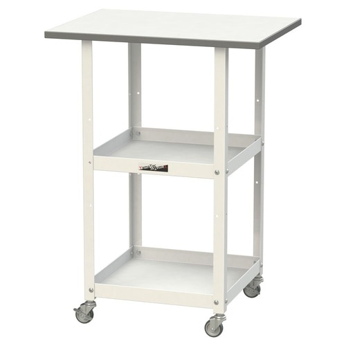 簡易作業台・運搬用カート・補助テーブルとして、1台3役の便利な天板付きワゴン!天面で作業しながら移動もでき便利。天板は表面硬度が高く摩耗に強い低圧メラミン天板。倉庫や工場での入荷検品、軽梱包作業等に。 |
