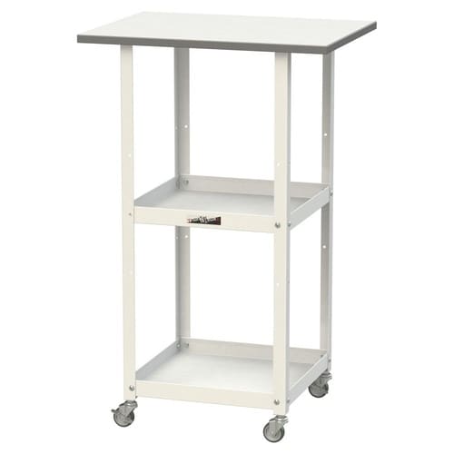 簡易作業台・運搬用カート・補助テーブルとして、1台3役の便利な天板付きワゴン!天面で作業しながら移動もでき便利。天板は表面硬度が高く摩耗に強い低圧メラミン天板。倉庫や工場での入荷検品、軽梱包作業等に。 |