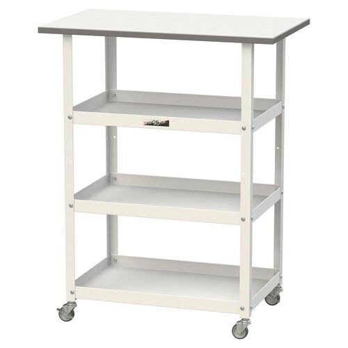 簡易作業台・運搬用カート・補助テーブルとして、1台3役の便利な天板付きワゴン!天面で作業しながら移動もでき便利。天板は表面硬度が高く摩耗に強い低圧メラミン天板。倉庫や工場での入荷検品、軽梱包作業等に。 |