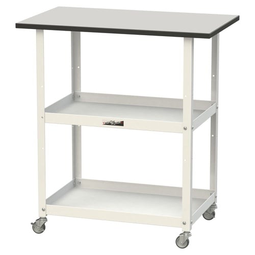 簡易作業台・運搬用カート・補助テーブルとして、1台3役の便利な天板付きワゴン!耐久性・耐薬品性・弾力性があり積載物を傷つけにくいRoHS2対応塩ビシート貼り天板。精密機器の加工・組立・検品現場等に。 |