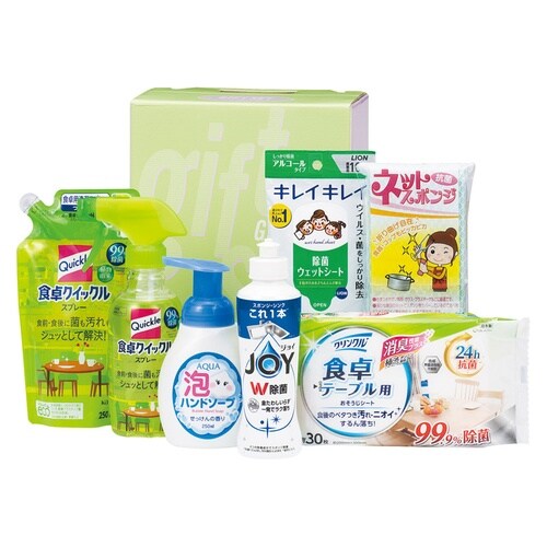 花王食卓クイックルスプレー(300ml)・花王食卓クイックルスプレー詰替用・アクア泡ハンドソープ(中国)(各250ml)・P&G除菌ジョイコンパクト(170ml)・クリンクル食卓テーブル用シート(30枚入)・ライオンキレイキレイお手ふきウェットシート(アルコールタイプ)(10枚入)・ネットスポンジ(中国)×各1