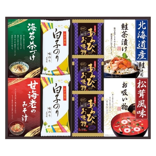 あわびを使用したフリーズドライと松茸風味のお吸い物、甘海老の味噌汁や海苔茶漬けなど豪華な山海の幸を詰め合わせました。 |