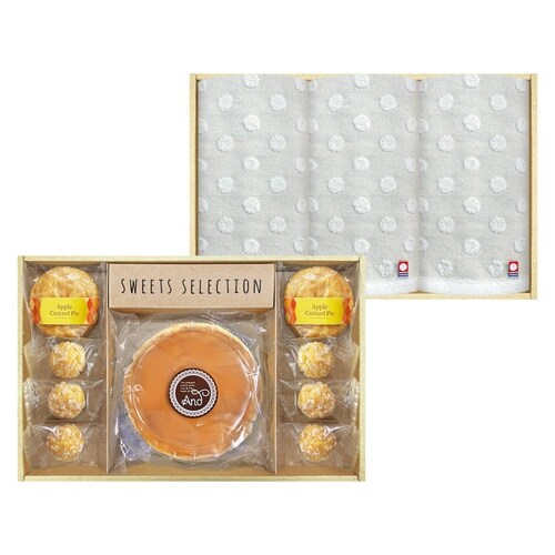 ふわふわなチーズケーキと、国産のりんごと濃厚な風味と滑らかな口どけのカスタードクリームを使用したパイに、サクサクな食感のシューラスクと、百十余年の歴史を重ねる今治タオルをセットしました |
