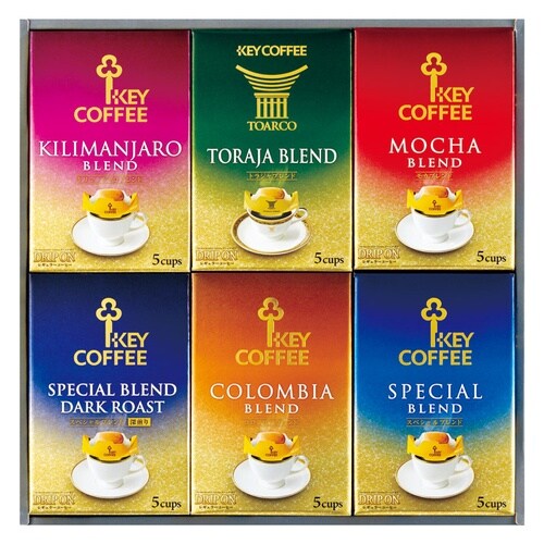 セット内容:トラジャブレンド・スペシャルブレンド・モカブレンド・キリマンジャロブレンド・コロンビアブレンド(各8g×5p)・スペシャルブレンド深煎り(…