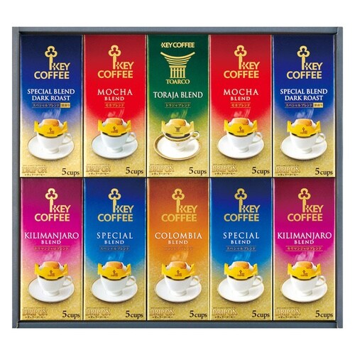 スペシャルブレンド・モカブレンド・キリマンジャロブレンド(各8g×5p)・スペシャルブレンド深煎り(7.5g×5p)×各2、トラジャブレンド・コロンビアブレンド(各8g×5p)×各1