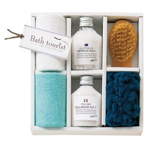 マイクロファイバークロス(中国)(25×25cm)×2、バスソルト(イタリアン)海塩(180g)・バスソルト(オーストラリア)海塩(175g)・ふわもこウォッシュタオル(中国)(22×22cm)・ブラシ(中国)×各1