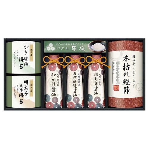 本枯れ鰹節(2g)×3、牡蠣醤油海苔・明太子風味海苔(各8切6枚)・天然醸造蔵仕込み卵かけ醤油・天然醸造蔵仕込み刺し身醤油・天然醸造蔵仕込み天然醸造醤油(各200ml)・瀬戸内藻塩(50g)×各1